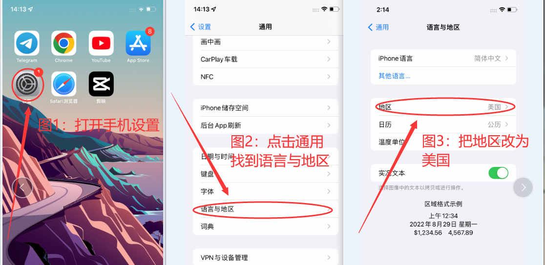 语言不需要修改,只把地区修改成美国就可以看了,修改完后要重启下手机